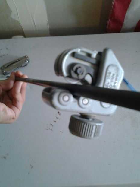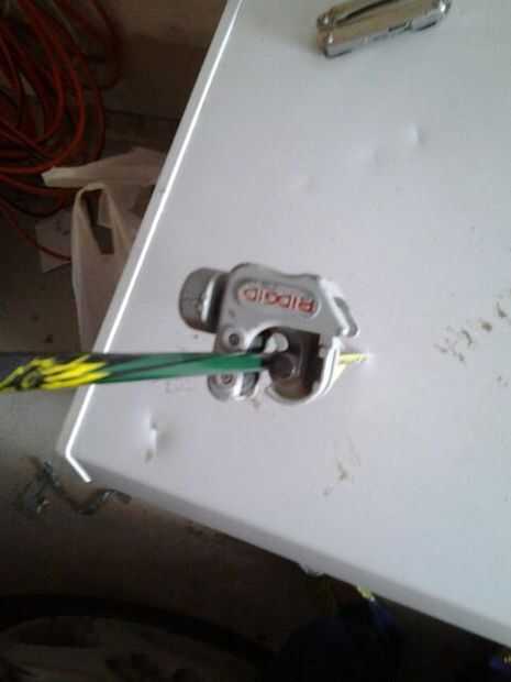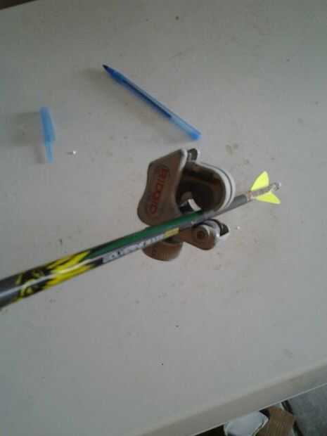tomar el cortador de tubo y tamaño de la flecha y apriete pero no demasiado apretado otro sabio resultará malo y usted conseguirá una astilla de vidrio de fibra. Círculo se arounmd la flecha y apriete lentamente y suavemente hasta que corte. Cuando oiga ruidos se agrieta poco apriete más suave que antes.