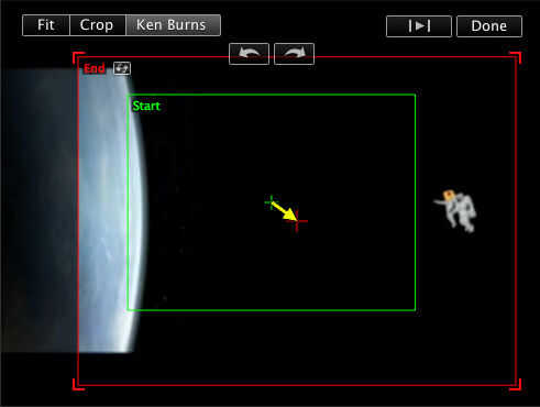 El segundo icono de la esquina superior izquierda es la herramienta Recortar. Utilice esto para pan o acercar la cámara a través de la diapositiva. Hay tres opciones, ajuste, recorte y Ken Burns. Estoy seguro de que hay probablemente más, no sé lo suficiente sobre iMovie pero saber configurarlas. Estos son los únicos que he usado. Fit es para exactamente como suena, cabiendo su imagen para el tamaño del vídeo que haya seleccionado. Se advirtió que podría recortar su imagen incorrectamente. Cultivo es para el cultivo de su propia imagen. Ken Burns es para el pan fresco y efectos de zoom. Esto es muy fresco y fácil de usar. Mientras que en el modo de cultivo podrás ver cuadros uno, dos o no sobre el cuadro de vista previa de vídeo. Ajuste no muestra ningún cuadro, cultivo muestra un cuadro verde y Ken Burns muestra cuadros rojo y verdes. Las cajas son fáciles de ajustar. Mueve la mano y la Cruz cambia su tamaño. Una vez hecho esto haga clic en el botón "done" para regresar o haga clic en la diapositiva siguiente y seguir recortando y panorámica.