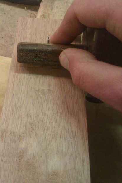 4 agarrar su calibrador de la mortaja y de la parte posterior de cada riel, ejecutar el calibre de las líneas del hombro hasta el final de la madera y el contrahilo y a lo largo hasta llegar a la línea de hombro - hacerlo en todos los carriles y en cada extremo.