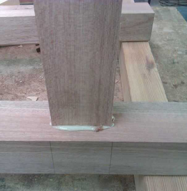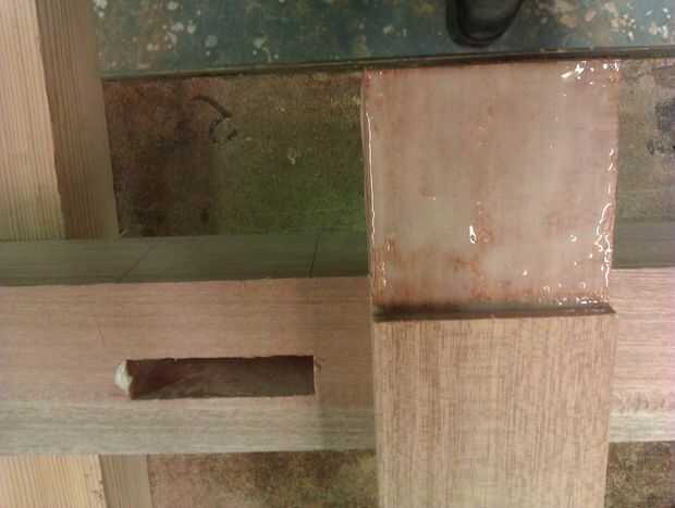3 ahora en cada riel, aplique el pegamento a las espigas - todo el camino alrededor y no te olvides de los hombros. Desea mucho pegamento en estos, así que como la puerta es estrecho hasta el pegamento cieno (me encanta esa palabra!) hacia fuera. Va a ser desordenado, pero es el pegamento que rezuma de la Unión que hace que para un conjunto apretado, sólido de agua.