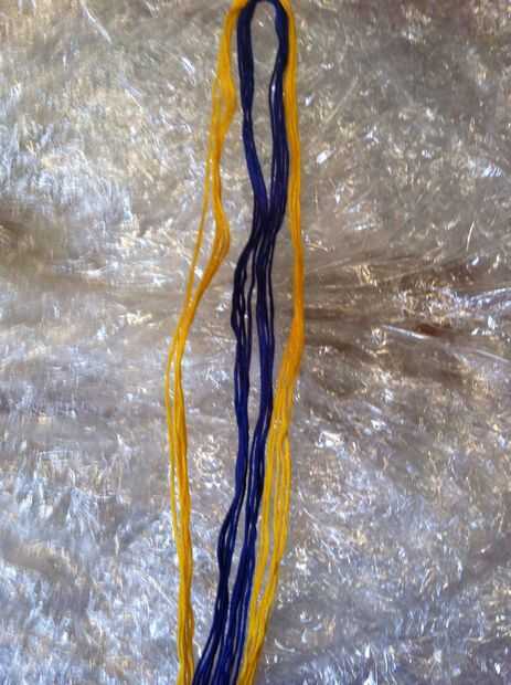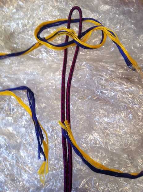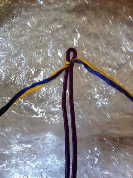 Para iniciar este paso tendrás que doblar el cable por la mitad. Ahora viene la determinación de qué color quiere ser serpentea abajo tu pulsera y el desea a los lados. Por ejemplo quiero que serpentea azul oscuro mi pulsera y amarillo a los lados. Tan para mí cuando dobla las cuerdas en medio deberían ver todas las cadenas azul en el medio. Ahora, es el momento para el nudo. Establecer las cadenas y coloque el cable en el medio donde hemos doblado nuestras cadenas. Ahora con un lado hacer un lazo y coloque el extremo sobre las otras cuerdas. Ahora toma el otro lado de las cadenas y poner a través del lazo que hemos hecho en el otro lado. Ahora dan a ambos lados un remolcador. Ahora que está hecho el nudo.