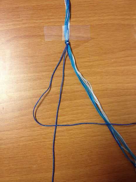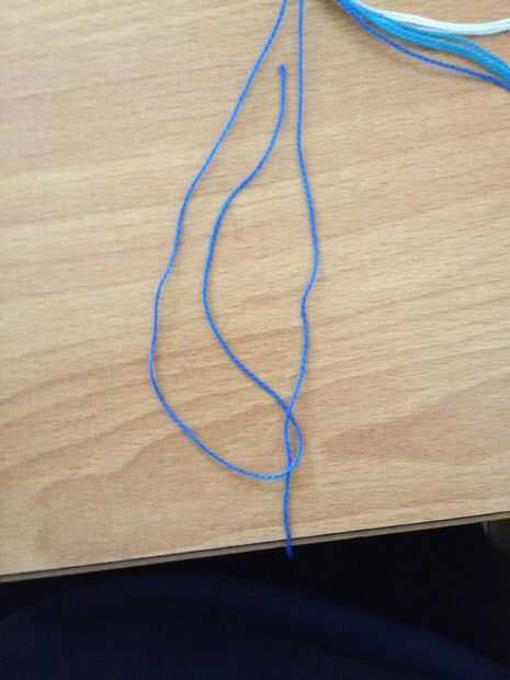Para hacer un nudo hacia adelante la primera cuerda cuelgue el otro haciendo la forma de un 4 (como se muestra arriba) y luego envolver la cola de la primera hebra debajo el segundo hacia la parte superior y tirando firmemente.