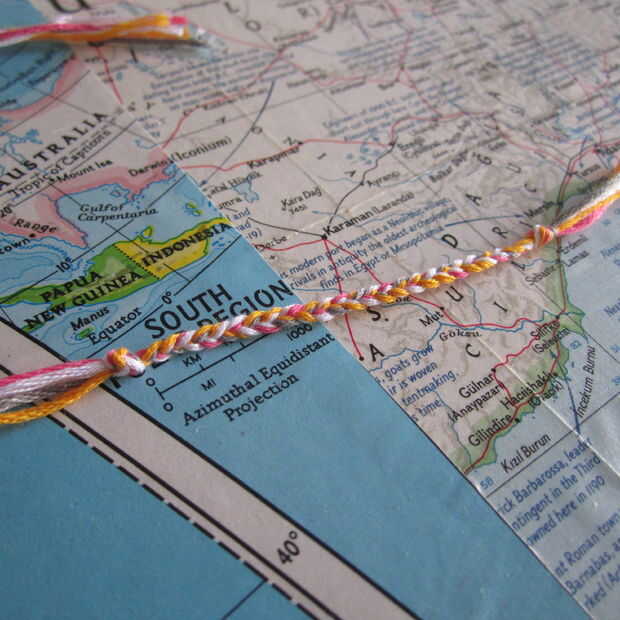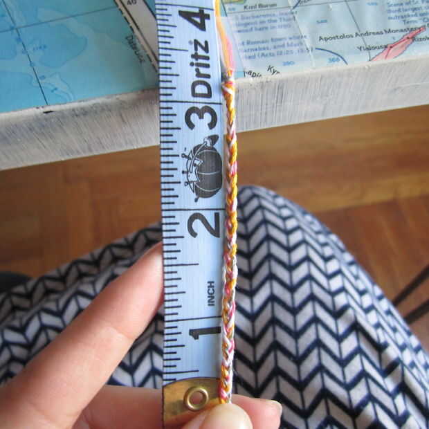 (Y por lo que todo el mundo sabe - cada pulsera acabada con 3 pulgadas de trenzado en cada extremo (tan 6 pulgadas en total) y 3-4 pulgadas de los nudos que forma la pulsera real.)