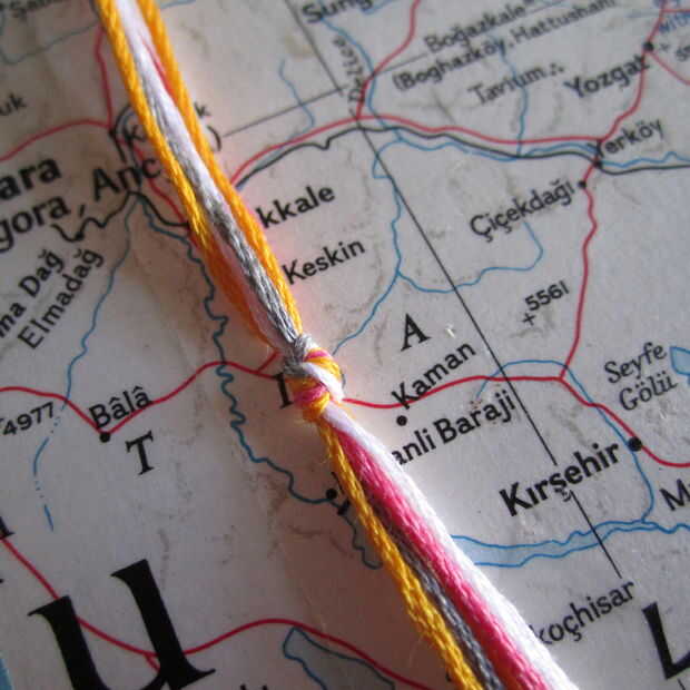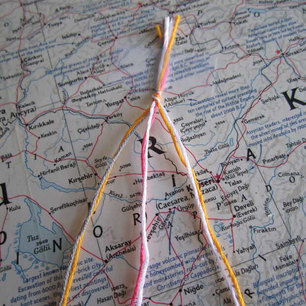 Esto adhiere a un tablero de la mesa o los pantalones o una almohada y trenza de tres pulgadas abajo de este nudo. Una vez que haya terminado su trenza, hacer otro nudo en la parte inferior de la trenza.