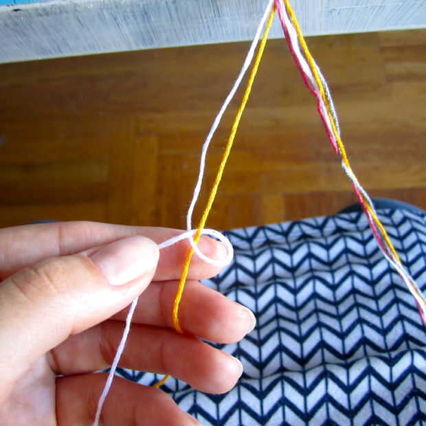 Una vez que estén en orden, tomar las dos primeras hebras. La cadena más a la izquierda va a crear la primera fila. Usted va ser anudar alrededor de las otras hebras de seda/hilo para ello.