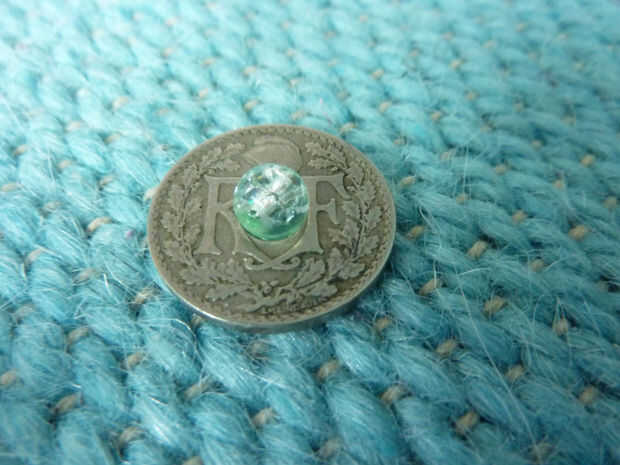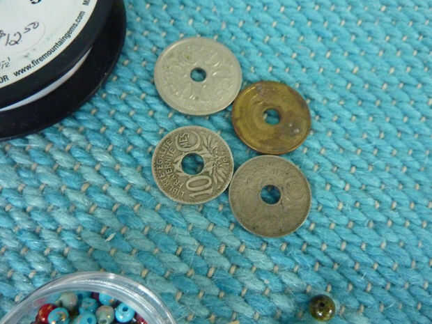 ~ Cualquier tipo de botón grande o una moneda con un agujero en el medio y un grano que es más grande que el agujero (esto hará más sentido si nos fijamos en las fotos). Encontré estas monedas en una tienda pero probablemente se puede encontrar en ciertos almacenes de grano.