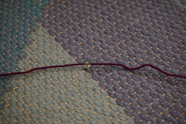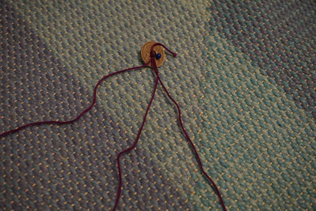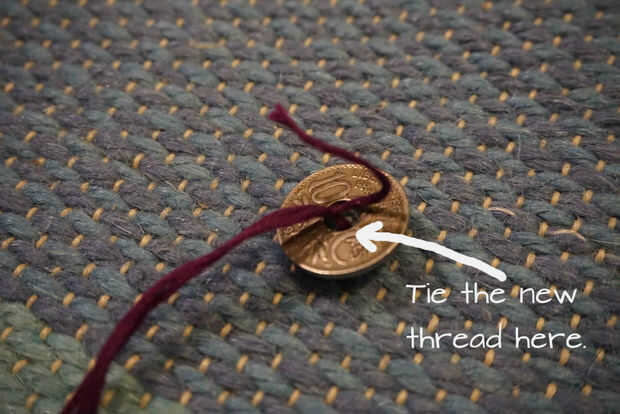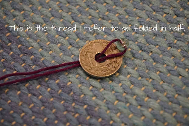 Primero cortar 2 ft o lo del hilo de bordar y deslice el talón bastante grande sobre él. Coloque ambos extremos a través de la moneda e incluso hasta esos extremos. Lazo en el otro filamento de derecho de igual longitud que el subproceso original sale de la moneda así que hay tres líneas (doblado por la mitad uno es igual a dos, véase el cuadro). Precisar la moneda por lo que permanece en su lugar y extendió los hilos.