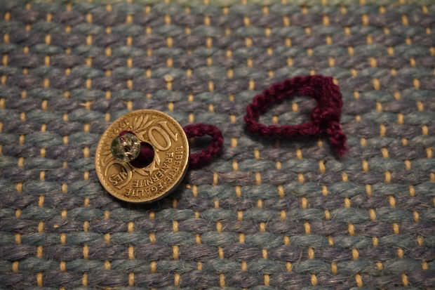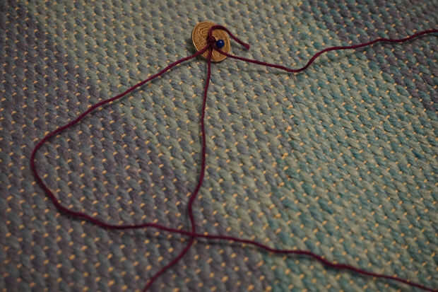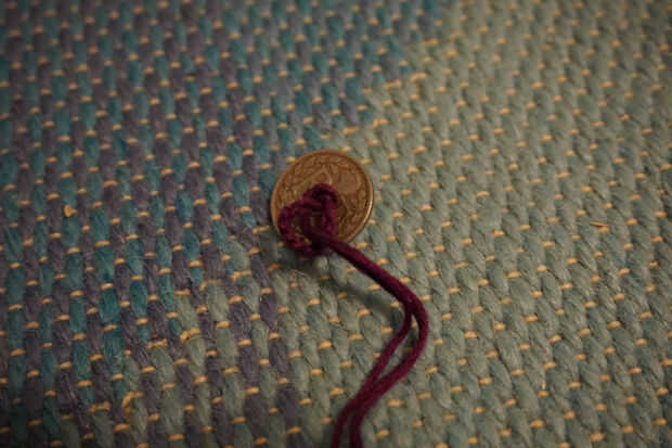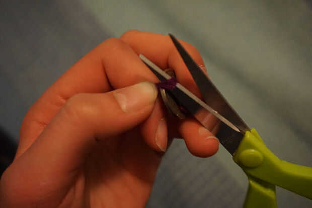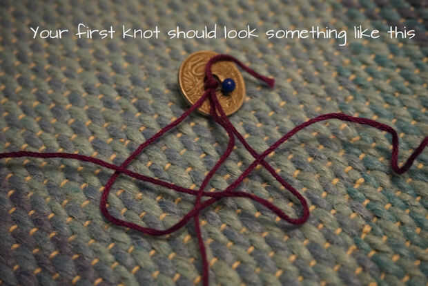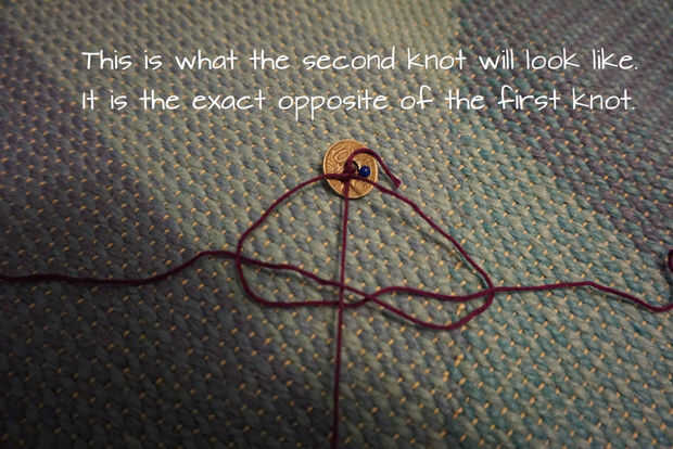 Una vez que ha hecho una longitud small-ish de nudos cuadrados, atar en un lazo en la base de la moneda. Asegúrese de que el nudo es super apretado y luego corte el sobrante. Luego haz otro nudo cuadrado y atar apagado. Asegúrese de que el segundo bucle apenas ajusta sobre la moneda, así que cuando estos tienen su pulsera juntos, el lazo no salga solo. Trabajarán al igual que un cierre de palanca.
