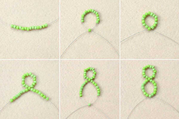 diapositiva 2, siete granos de la semilla verde de 4mm en cada hilo otra vez, cruzar los cables para granos de la semilla de otro verde 4mm y apriete los alambres;