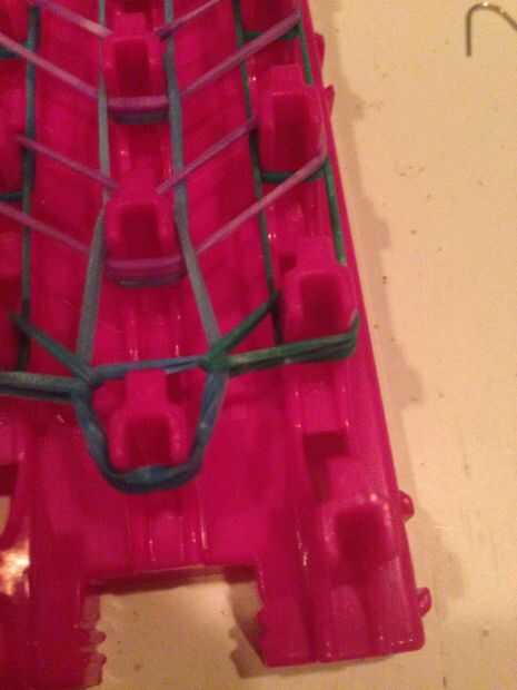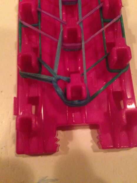 Muy bien así que aquí tiene la parte más difícil. En primer lugar, enganchan en la banda izquierda externa en la primera clavija y engánchelo en su segunda clavija. Hacer lo mismo con el otro lado.