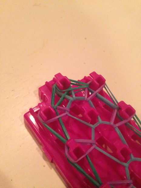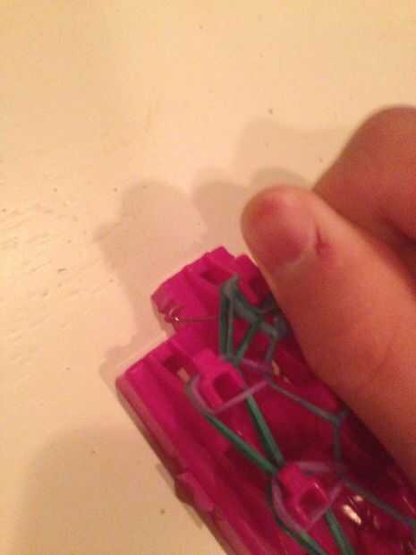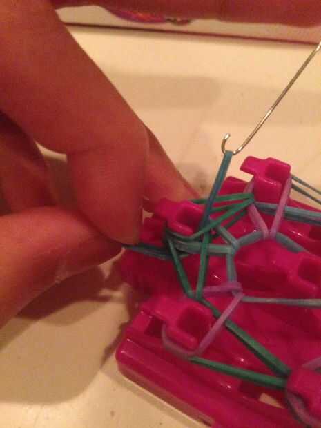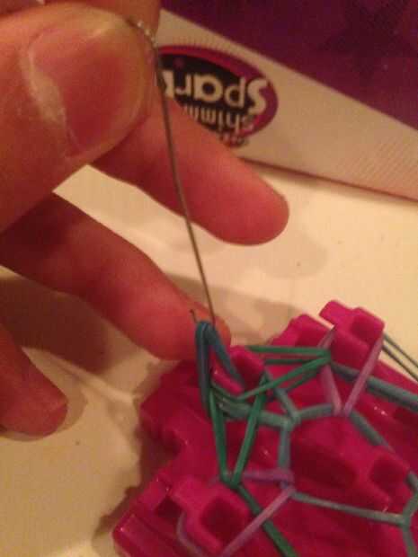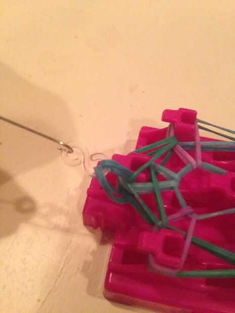 Ahora youre que va a querer ir hasta el final del mazo que no tiene el final de la banda en él y pegar el gancho a través de todas las bandas de goma. Ahora tomar una banda y el palillo en el extremo del gancho, retire el gancho a través de gancho en el otro lado de la misma banda y agregar el clip s.