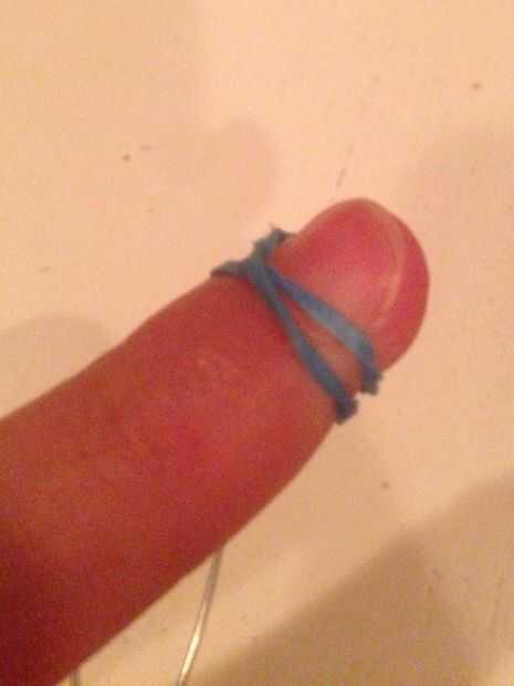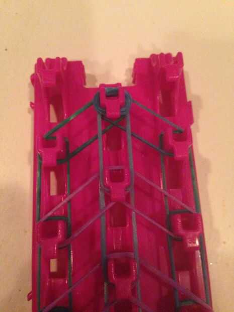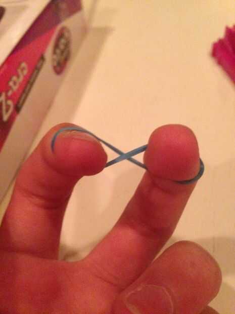 Primero tomar una banda elástica y tuerza en una figura 8. Ahora ponerlo en la clavija superior del telar. Youre que va a utilizar más tarde esta banda para poner el clip de s en.