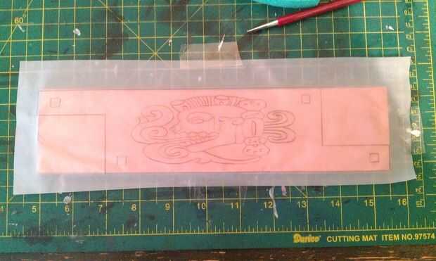 La transferencia de la pulsera graficada en papel de calco. Entonces el diseño a mano alzada o traza el diseño sobre el papel así. Usted puede meterse con la imagen para conseguir la correcta colocación en el contorno de la trazada de salida. Tenga en cuenta un espacio libre de 1/4 del borde y donde van los remaches es ideal para la imagen a rastrearse dentro. Después de trazar el diseño de la pulsera en el papel, tomar la madera impermeable y frotarla con el lado cónico a lo largo del lado liso de la piel. Esto se conoce como pulido de la piel; le ayudará a compuesto las fibras de la piel juntos y que sea más fácil trazar y esculpir la imagen en la tira de cuero. Después de tome una esponja limpia y humedézcalo con agua. Luego humedezca el cuero con la esponja. Esto hará que trazar el diseño en la piel posible y más fácil, también. Este proceso se conoce como "Cubierta del cuero". Ahora toma el cuero en una superficie plana bien luz. Lugar el diseño trazado en la parte superior del cuero entubado. Yo generalmente con cinta adhesiva el contorno trazado sobre la superficie para que no mueva la voluntad de trazar el diseño en el cuero. Ahora trazar cuidadosamente el contorno sobre el cuero con su lápiz de punto de herramienta de modelado. Para el cuadrado donde los remaches se colocarán con cuidado intentar hacer una sangría en el centro de la Plaza. No quiere dejar rastro fuera que forma cuadrada porque siempre estará allí y es realmente sólo utiliza una guía de dónde colocar la imagen en la pulsera y no solapan el diseño en donde se colocarán los remaches. Después de trazar el diseño en el cuero quitar el papel y prepárate para el siguiente paso.