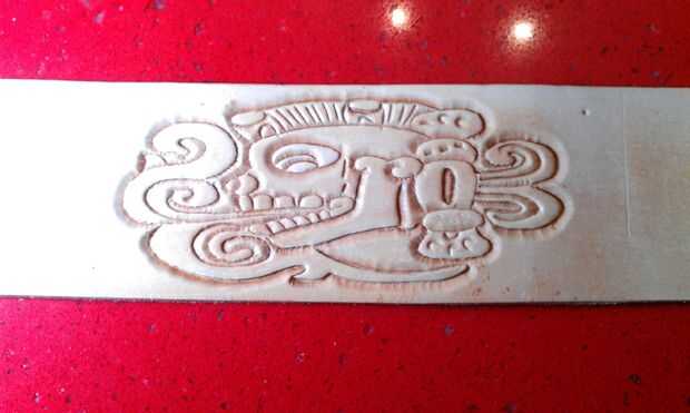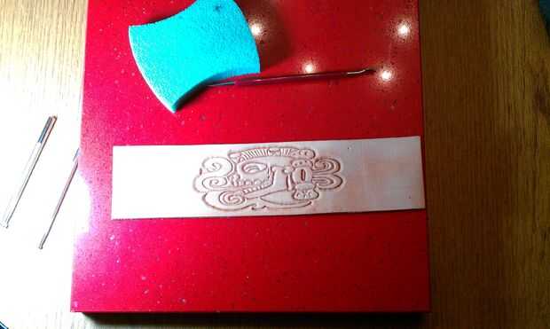 Este paso requerirá mucha paciencia y tiempo posiblemente. Ahora después de que la imagen se transfiere, quieres sacar la losa del granito/de mármol. Usted necesitará caso posiblemente la piel otra vez y durante el tallado, herramientas y suavizar la piel. Es importante no sobre saturar la piel con agua. Luego tomar el cuchillo del eslabón giratorio y tallar la imagen en la piel cuidadosamente. Después talla la imagen en el cuero sacar tus sellos de cuero para el contorno de la imagen de la herramienta en la piel más profunda. Para este proyecto se utilizará sólo un Beveler suave cuero sellos. Tomar el borde del sello en el extremo del mango y coloque en el borde externo del diseño tallado. Entonces golpeó la parte superior de la manija con un mazo/martillo para sangrar al Beveler en el cuero. Use suficiente fuerza como para asegurar el beveler es "traer el diseño" en la piel. Demasiada fuerza podría perforar a través de la piel y arruinar su proyecto y dañar el mármol de la losa y sus herramientas. Y demasiado poco de la fuerza no aparecerá la imagen bastante. Así que utilice la cantidad correcta de fuerza. Es realmente una especie de ensayo y error de la regla para aprender. Pero sea paciente y usted aprenderá con facilidad. Después de toda la imagen se funda en el cuero, usted necesitará volver a utilizar la aguja de punto de herramienta de modelado pero va a utilizar el lado de la cuchara para suavizar los bordes de la imagen y la hundida frente a parte para suavizar los solapes de ustedes herramientas al beveler dentro de la imagen. Meterse en los lados para suavizar a un uniformado sangría. Tomar la cuchara modelado contra la imagen ayudará a se pronuncia el diseño y ayudan a definir realmente más. Asegúrese de que todas las piezas de contorneada fileteadas se suavizan lo suficiente como para hacer el diseño parece impecable.