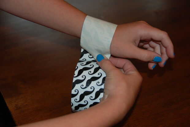 Primero necesitas doblar el lado no adhesivo de la cinta alrededor de su muñeca y corte la longitud de la muñeca.