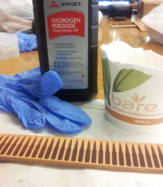 Porque el cuero fue quemado con el láser, ha creado un caracter como el polvo. Así que para evitar la diseminación a la piel sin tocar este char debe limpiarlo con agua oxigenada o Alcohol.