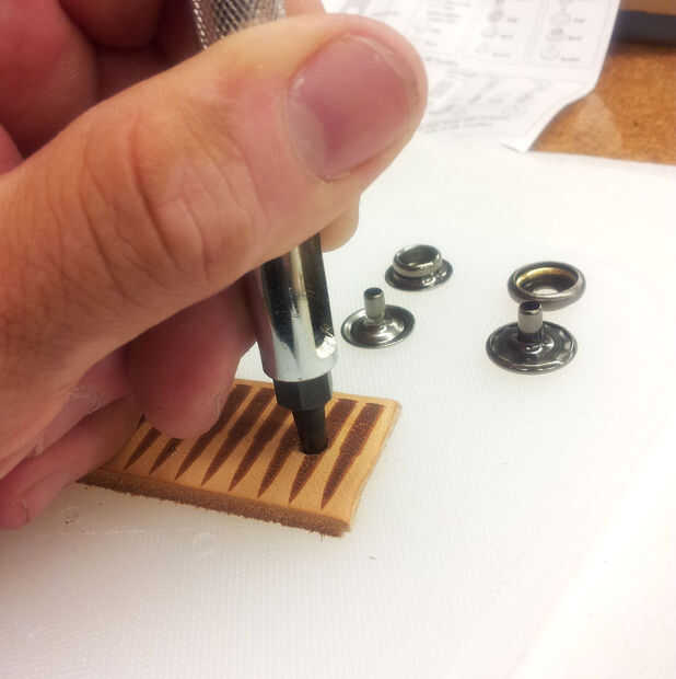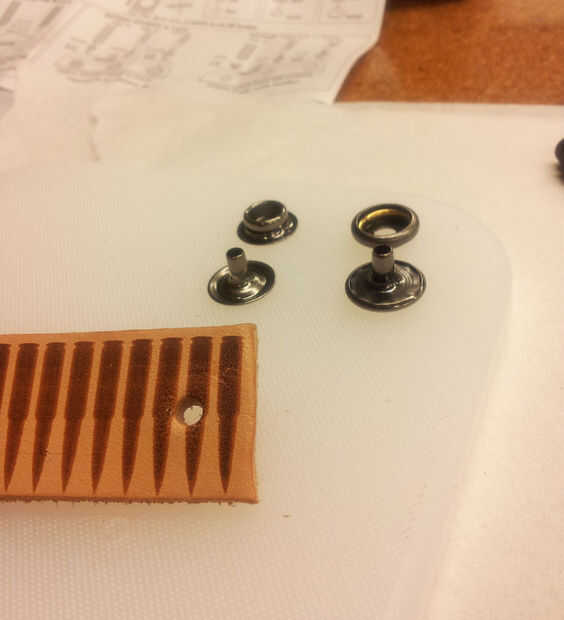 Una vez que el cuero se limpia su tiempo añadir los agujeros donde se colocarán los broches de presión sobre el cuero. Porque ya hemos medido el cuero a nuestra muñeca. Sólo necesitamos tener un agujero en cada extremo de la piel para los broches de presión. La herramienta que le ayuda a hacer los agujeros se llama una perforadora de cuero. Ahora que los agujeros se complete su tiempo a añadir color a la piel.