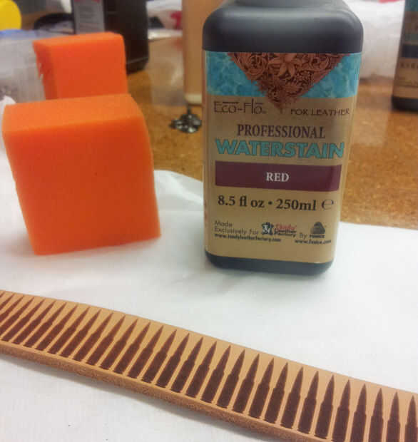 Ahora es el momento para añadir algunos colores. He decidido añadir un tinte rojo para el cuero. Mejor utilizar una esponja húmeda y luego añadir la mancha a la esponja. La mancha actúa algo como una acuarela, tan la mancha más que añades más pronuncian se convertirá en color rojo el cuero.
