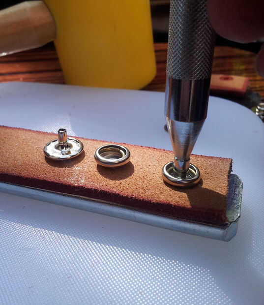 a con éxito instalar un complemento uno debe tener un complemento setter específicos a la medida de la presión y un pequeño yunque de sus broches de presión descansar en junto con un martillo de goma para Junte los componentes. Necesitamos para nuestro complemento, coloque la tapa debajo de la piel con la madre venga lanzó el agujero y coloque el conector en el vástago y luego coloque el regulador de la presión en el vástago y luego golpear con el mazo.
