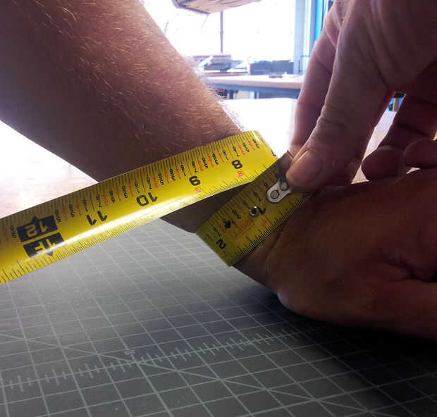 El primer paso para hacer una pulsera personalizada es determinar cuánto de una pulsera que se necesita para envolver cómodamente alrededor de su muñeca. Para ello toma una cinta métrica y envuélvalo alrededor de su muñeca para determinar qué tan grande es su muñeca. Mi muñeca es de alrededor de 7 pulgadas.