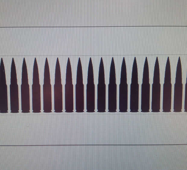 Desde soy fan de guns y lo que no, he decidido ilustrar balas de AK-47 en illustrator. Una vez mas mi ilustración de una sola bala, entonces copié los en una línea grande de balas que estiraría de un lado de la piel a la otra.