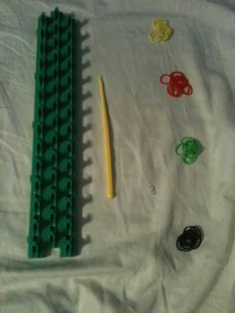 Para esta pulsera que uso: 13 bandas amarillo, 13 bandas rojo, 13 bandas verdes, 13 bandas negras, (para el fondo) Gancho de una S o C, Un gancho telar, Y un telar de Cra-z. No tienes que usar los mismos colores que hago, lo que tienes funciona muy bien.