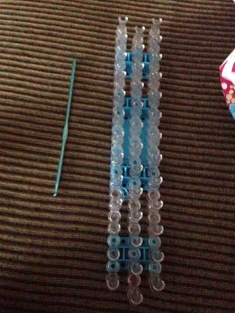 se necesita:grupos de 30-40 según el tamaño de su muñecaUn telarUn gancho deUn clip de c o s* Usted puede usar dos dedos en lugar de un telar *Paso 1: A partir de tu pulsera Su primera banda de la torceduraPaso 2: Lugar dos bandas más en la cima de l