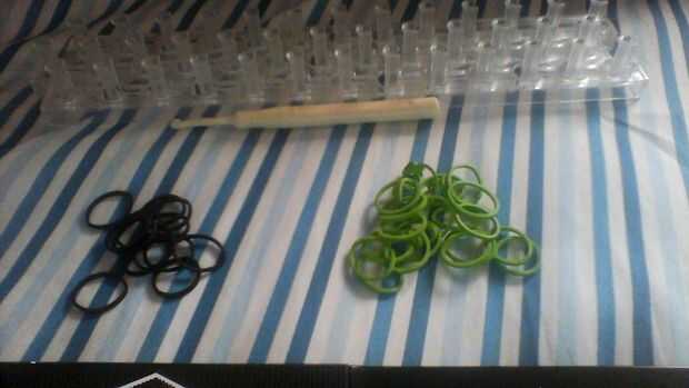 se necesita:grupos de 30-40 según el tamaño de su muñecaUn telarUn gancho deUn clip de c o s* Usted puede usar dos dedos en lugar de un telar *Paso 1: A partir de tu pulsera Su primera banda de la torceduraPaso 2: Lugar dos bandas más en la cima de l