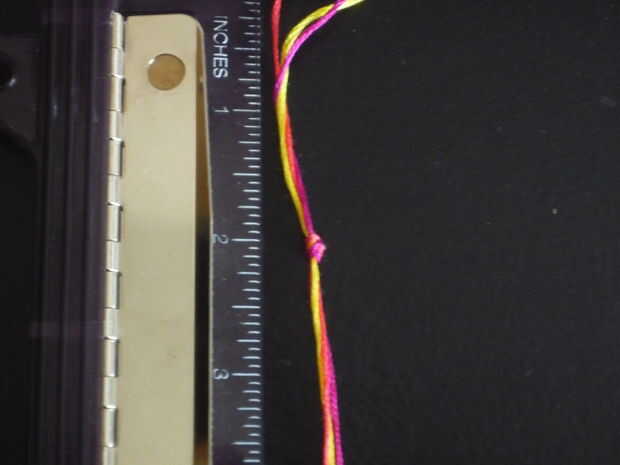 Todo su número elegido de seda del bordado de color y un nudo cerca del extremo. Deja cerca de dos pulgadas en la parte superior. Este espacio se utilizará para grabar su pulsera a una superficie plana mientras se trabaja y también para atar al otro lado cuando esté completamente terminado.