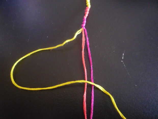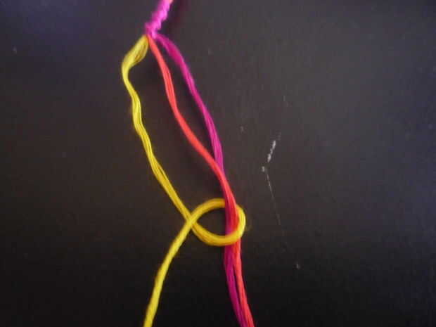 4. a continuación coloque el hilo de bordar amarillo debajo de los otros dos colores y tiran a través en el lado que originalmente empezó el. (véase cuadro III)