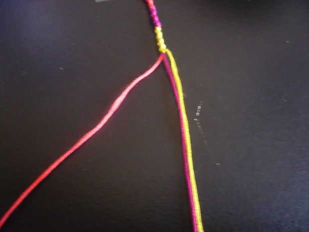 4. a continuación meter el hilo de bordado rosa bajo los otros dos colores y tiran a través en el lado que originalmente empezó el. (véase cuadro III)
