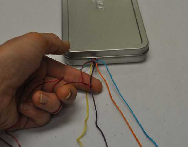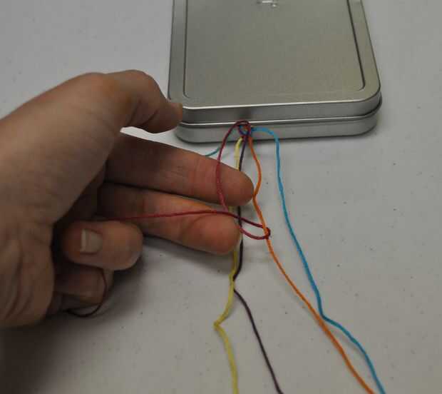 En este momento debe sentir que está recibiendo la caída de este. Recoger el hilo de rosca rojo a su izquierda. Iniciar dos nudos en orden de izquierda a derecha: siguiente amarilla, luego violeta, naranja y por último azul.