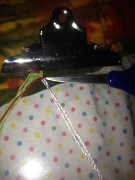 esto es como hacer una pulsera de la amistad peruano onda. Se necesita: 1. 3 o más colores de cadena 2. Tijeras 3. Gruesa cadena a nudo en 4. Portapapeles