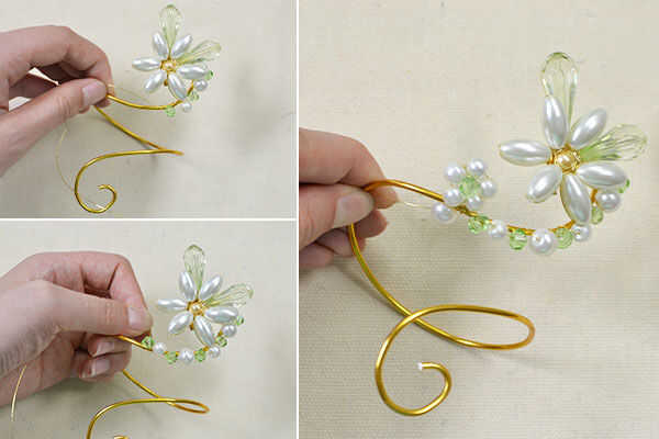 5, consulte el paso 1 para hacer otra flor de grano de la perla con 5 perlas de 4mm blanco que rodean una gota Facetada 4mm verde. Luego, agregar la flor de grano de la perla en el alambre de aluminio dorado a través de cable de cobre (como se muestra en la imagen);