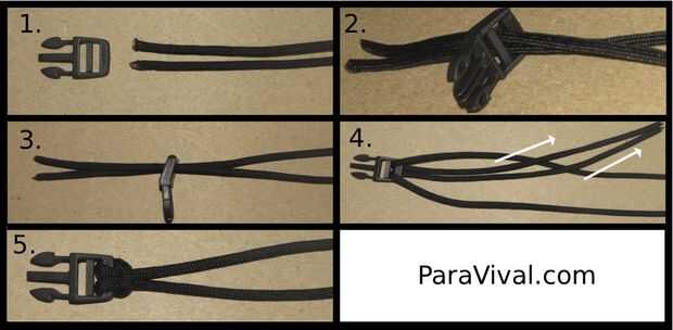 1. doblar el 10' pedazo de paracord en la mitad por lo que se trabaja con ambos extremos juntos. Haz el lanzamiento lateral hebilla el tiene 2 ranuras y colocarlo junto a los dos extremos.