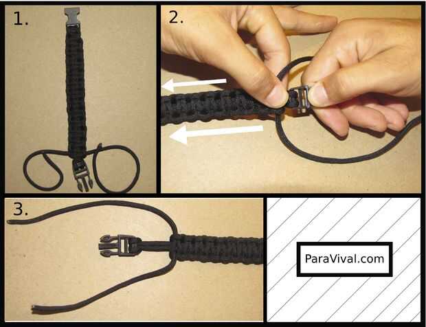 Alternar los pasos 6 y 7 hasta llegar a la hebilla en la parte inferior. No hagas tus nudos demasiado apretados o desentrañar su pulsera en un momento de necesidad que será mucho más difícil.