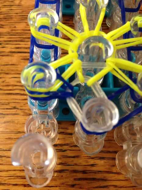 Ahora reanudar su gancho y lazo de la banda azul en la parte inferior. Do a cada banda en el telar.