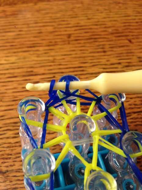 Paso 1: fuentes de Necesita el telar, el gancho, bandas del arco iris y un clip c o s.Paso 2: Colocar las bandas Get ready. Este es un gran paso. Comience colocando su primera banda de color desde el pasador central a la patilla izquierda. Luego, con