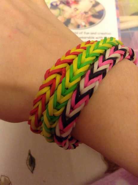 Esta es la pulsera como se verá cuando esté terminado. Yo recomiendo usar 3 colores diferentes para esta pulsera. Antes de poner las bandas en el paso siguiente Asegúrese de que doble todas las bandas, si crees que me refiero a hacer una banda de la