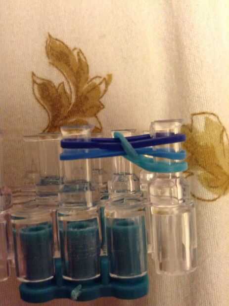 Esta es la pulsera como se verá cuando esté terminado. Yo recomiendo usar 3 colores diferentes para esta pulsera. Antes de poner las bandas en el paso siguiente Asegúrese de que doble todas las bandas, si crees que me refiero a hacer una banda de la