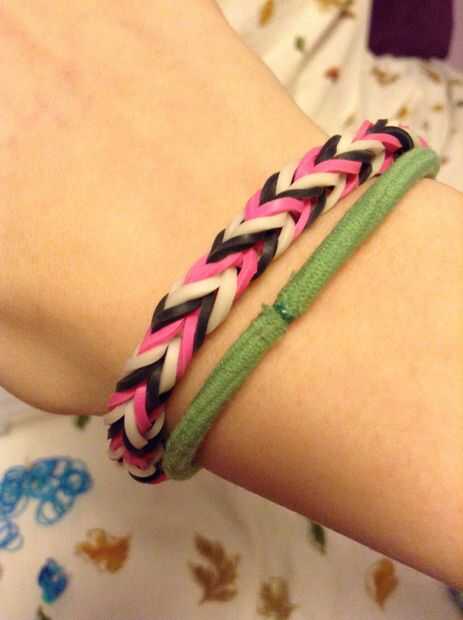 Esta es la pulsera como se verá cuando esté terminado. Yo recomiendo usar 3 colores diferentes para esta pulsera. Antes de poner las bandas en el paso siguiente Asegúrese de que doble todas las bandas, si crees que me refiero a hacer una banda de la