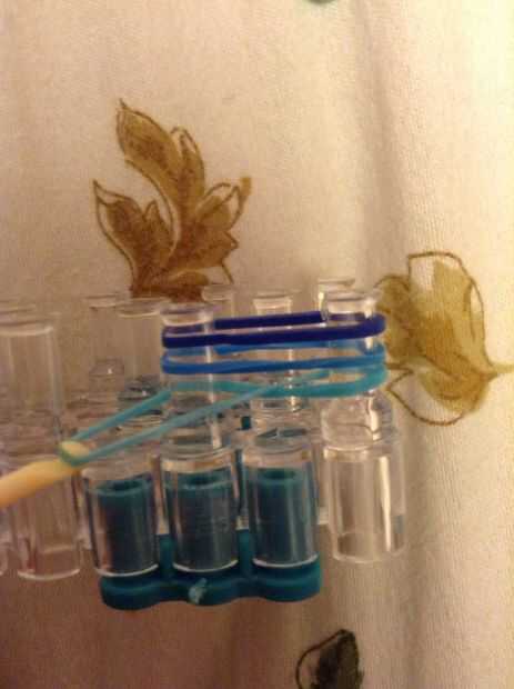 Esta es la pulsera como se verá cuando esté terminado. Yo recomiendo usar 3 colores diferentes para esta pulsera. Antes de poner las bandas en el paso siguiente Asegúrese de que doble todas las bandas, si crees que me refiero a hacer una banda de la
