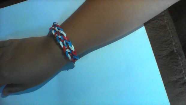Esta es la pulsera como se verá cuando esté terminado. Yo recomiendo usar 3 colores diferentes para esta pulsera. Antes de poner las bandas en el paso siguiente Asegúrese de que doble todas las bandas, si crees que me refiero a hacer una banda de la tapa que no, usted sólo necesita dos bandas y ponerlos encima de la otra.