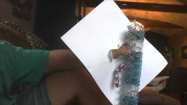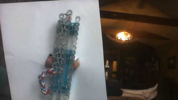 Ahora vamos a hacer una extensión. Estoy usando trece bandas. Se inicio en la flecha y la parte superior y hacer un zigzag hacia abajo. Y bandas doble otra vez. Si vas hacia abajo 13 tendrá 26 bandas. Luego coloque la pulsera en la clavija de la parte inferior. Luego poner el gancho en el tat peg Colóquese la pulsera, tire de las bandas y agarrar la parte inferior dos. Luego poner las dos bandas en la clavija a la derecha, luego agarra la parte inferior dos que está en la clavija correcta y llevarlo a la clavija de la izquierda. Hacer todo el camino hasta el telar. Luego puso una c clip en todas las bandas que están en el tat peg tiene la flecha en él. Luego tire de ella y conectarlo al otro lado de la pulsera... Mi pulsera es de un color diferente ahora porque mina cayó aparte.