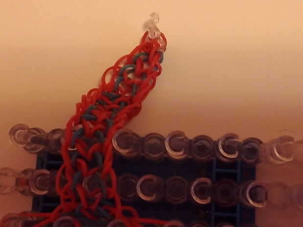 Poner una banda en el medio y el lazo sobre las bandas en la parte inferior en el medio no en los bordes si lazo en los bordes se arruinara tu pulsera y tendrás que empezar todo =-[. Otra vez el paso 4 a continuación hacer lo que te dije en el texto anterior y seguir repitiendo hasta que su creación es lo suficientemente larga para que quepa en su muñeca.