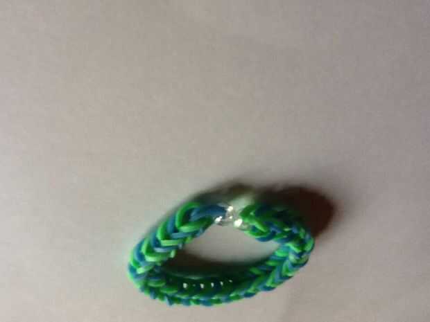 Esta es la pulsera como se verá cuando esté terminado. Yo recomiendo usar 3 colores diferentes para esta pulsera. Antes de poner las bandas en el paso siguiente Asegúrese de que doble todas las bandas, si crees que me refiero a hacer una banda de la