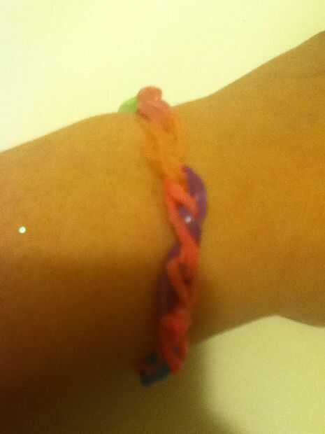 Esta es la pulsera como se verá cuando esté terminado. Yo recomiendo usar 3 colores diferentes para esta pulsera. Antes de poner las bandas en el paso siguiente Asegúrese de que doble todas las bandas, si crees que me refiero a hacer una banda de la