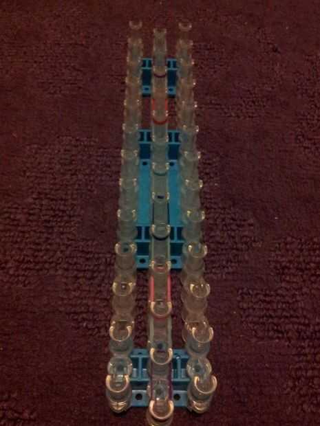 Esta es la pulsera como se verá cuando esté terminado. Yo recomiendo usar 3 colores diferentes para esta pulsera. Antes de poner las bandas en el paso siguiente Asegúrese de que doble todas las bandas, si crees que me refiero a hacer una banda de la