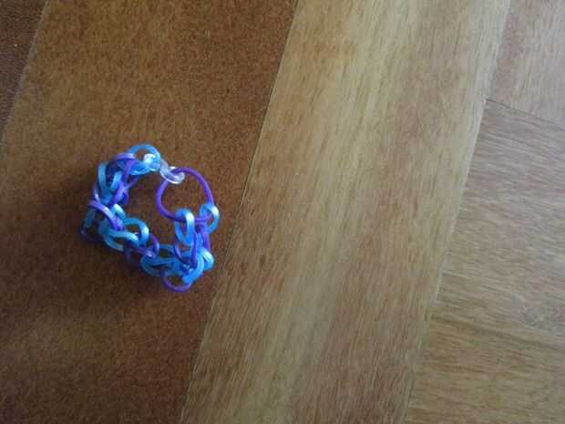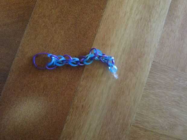 Esta es la pulsera como se verá cuando esté terminado. Yo recomiendo usar 3 colores diferentes para esta pulsera. Antes de poner las bandas en el paso siguiente Asegúrese de que doble todas las bandas, si crees que me refiero a hacer una banda de la