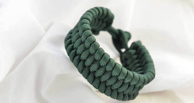 Para hacer la pulsera necesitará paracord 550, tijeras y un mechero. Opcionalmente se puede considerar una hebilla de la pulsera o un grillete para hacer tu pulsera se vea un poco más profesional. Generalmente termino estas pulseras con el nudo de la cuerda de seguridad (también conocido como el nudo de diamante o de amistad).